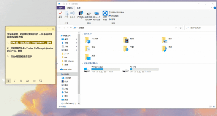 InfiniTrader_xxx的文件夹,并删除(例如财富期货无限易名称为InfiniTrader_QhCaifu)双击桌面图标重启程序
