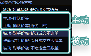 优先合约使用 FAK 指令、以对手价委托报单,以上的模式都会监控盘口数量报单,不考虑盘口数量即为报单手数等于用户设置的委托量。请注意:被动模式下使用的是 FAK、FOK 指令,产生的撤单次数不计入交易所统计。